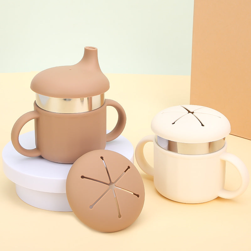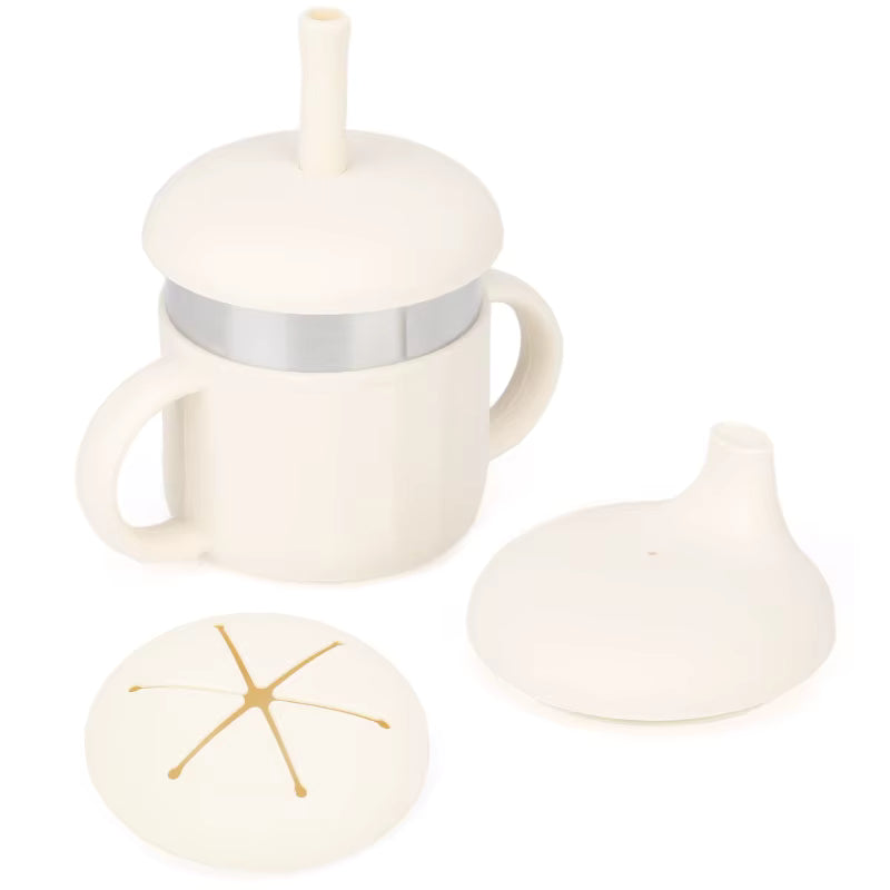 Fra en av våre produsenter får vi denne praktiske 6-i-1 koppen under vår egen merkevare - piips. Koppen er produsert i rustfritt stål (304) og silikon som er både FDA-godkjent og med produksjonskrav som etterlever BfR XV (LFGB). Pakken består av en stålkopp på 220ml, en silikonhylse, tutekopplokk, sugerørlokk og et lokk som gjør at koppen også kan brukes som snackbeholder e.l.